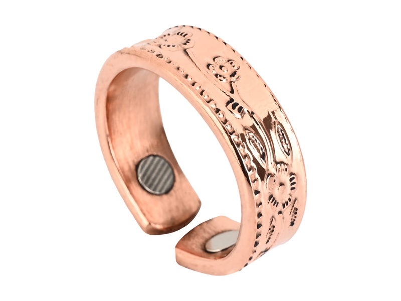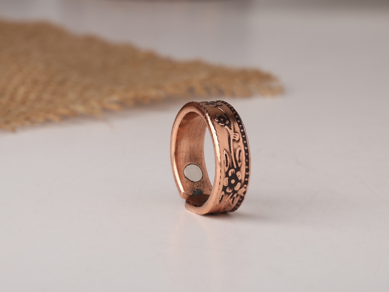 The Engraved Floral Copper Ring with Magnets is a beautifully designed piece of jewelry crafted from high-quality copper. Featuring intricate floral engraving, this ring combines traditional craftsmanship with elegant style.